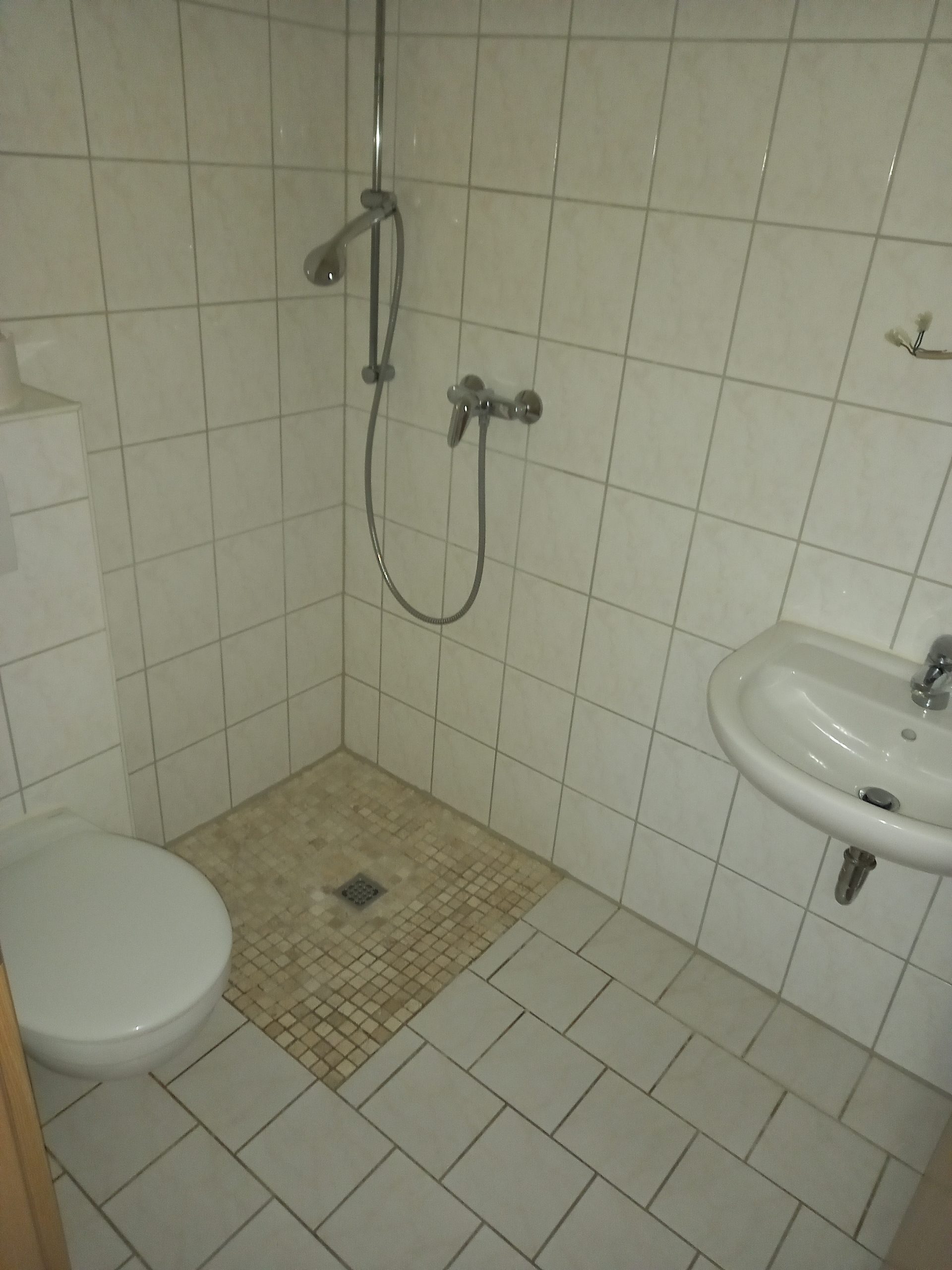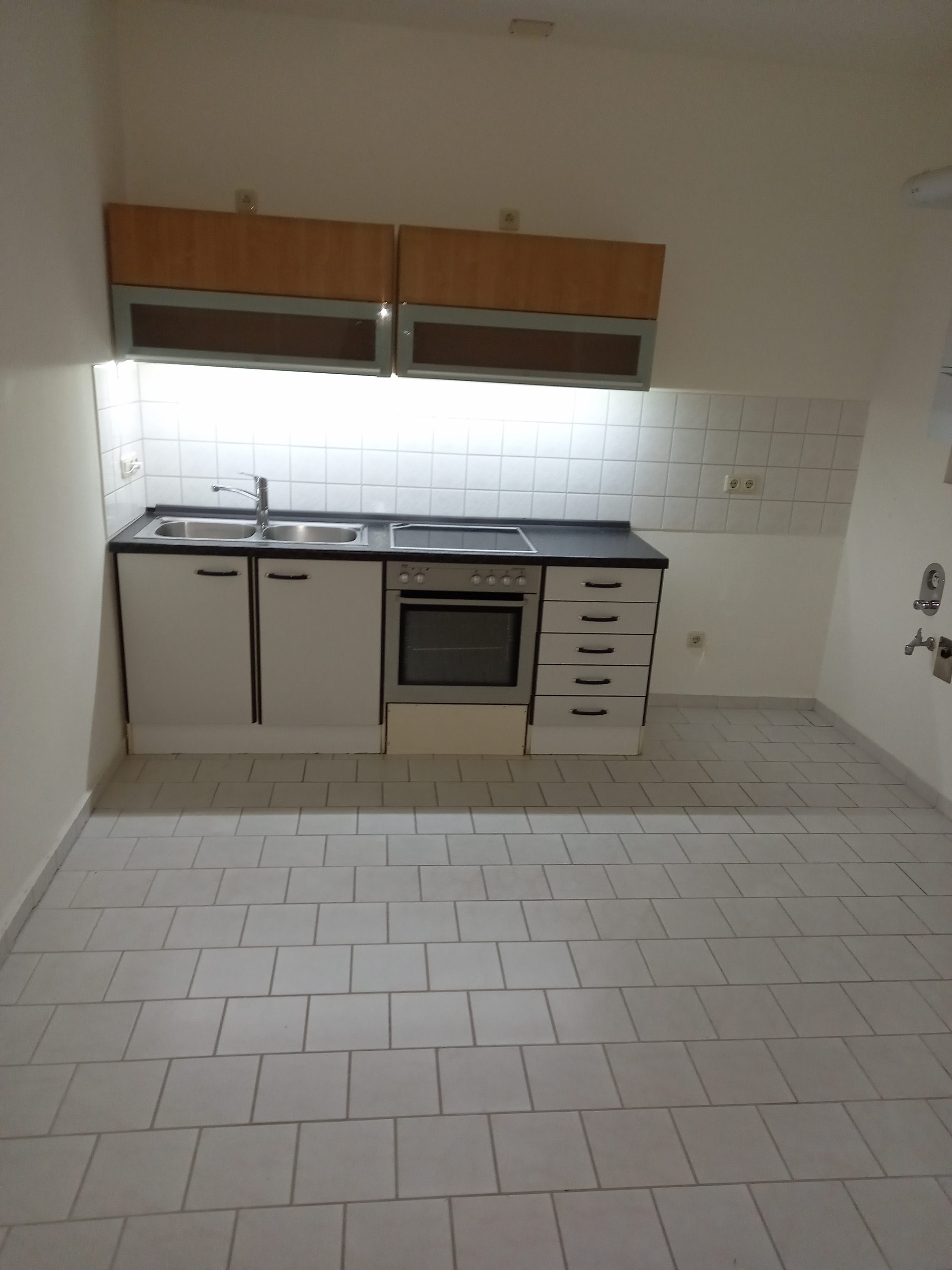 Das kleine Badezimmer der Wohnung ist mit einer Dusche ausgestattet. Die zum geräumigen Wohnzimmer offene Küche verfügt über eine kleine Küchenzeile, die vom Vormieter übernommen werden kann.